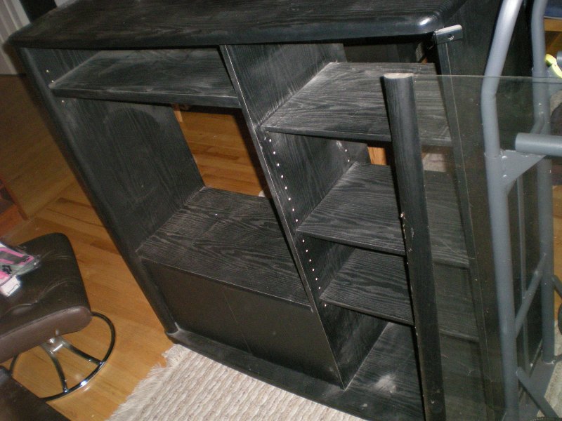 We now have a spare entertainment center, free to a good home. It is large and black and heavy: specifically, 47” tall × 47½” wide × 17½” deep, with a 27¾” wide × 23” high bay for an old-style cathode ray tube, a 17¼” wide × 43” high bay for stereo components (with three adjustable shelves and optional glass door), a 6” high shelf above the TV bay, and a storage bay with opaque doors below the TV. I figured I’d list it here before trying out Freecycle.